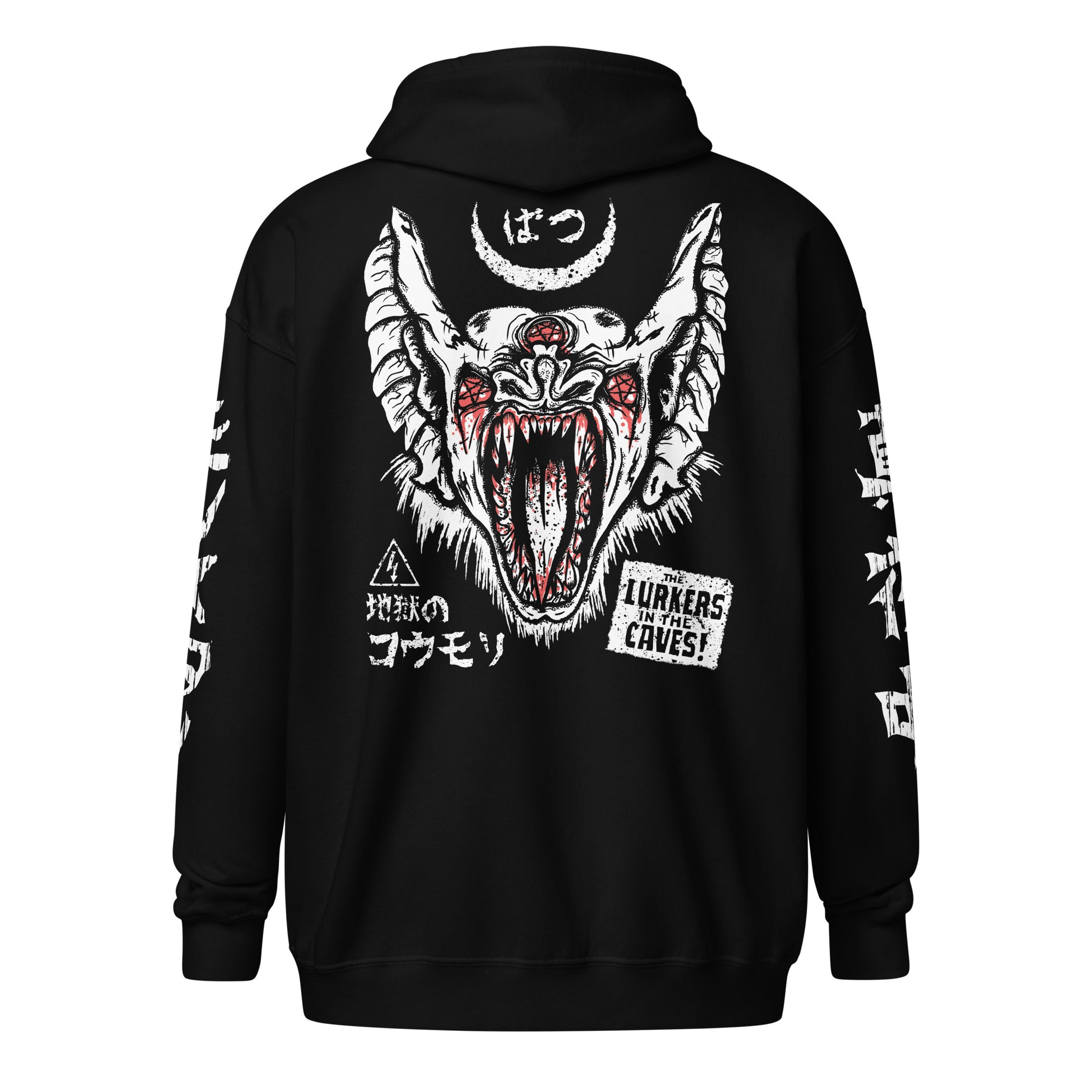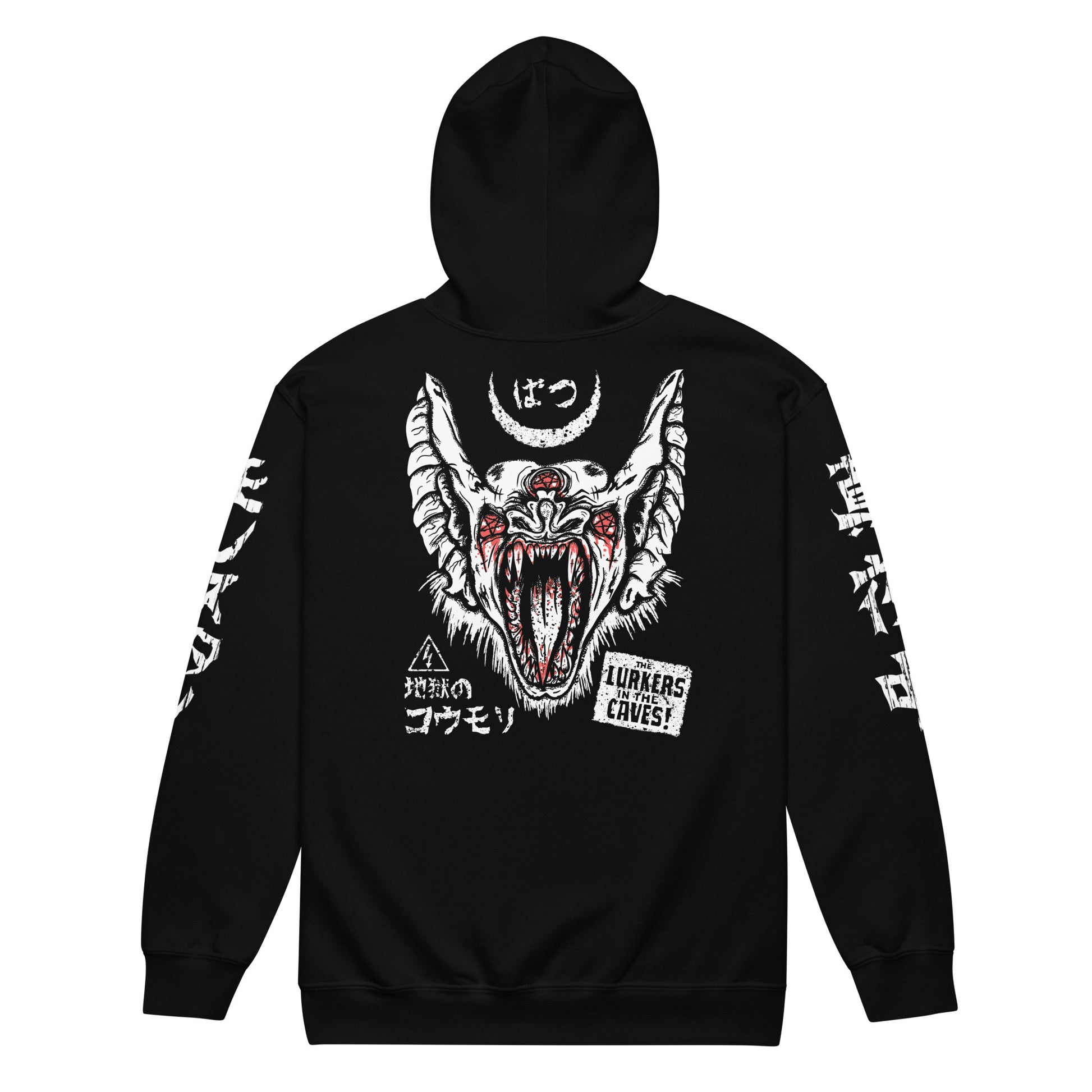Tales of Terror and Suspense! This issue: The Lurkers in the Caves, The cursed Bats from Hell! A mashup of retro horror comics and manga this hoodie will quickly become your new favorite. It’s made from soft fleece inside and outside, with a sturdy metal zipper, convenient front pockets, and a hood with color-matched drawstrings.